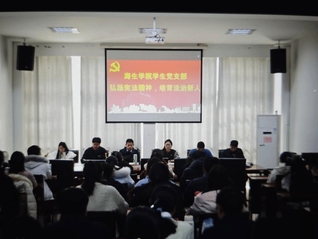 12月10日,依托“海梦启航”一站式员工社区,员工党支部开展“党员法治领学”活动。党总支副书记孙新华、学工办主任郭海松、团委书记王晶晶、辅导员霍福松、辅导员许璐、讲师顾晓天参加。员工党员、发展对象和入党积极分子积极担任“法治知识领学员”,组织案例研讨、知识问答等活动,领学宪法条文、解析生活法律常识、分享学习心得。参会成员纷纷表示将以身作则,带头增强法治观念,扛起学风建设责任,营造风清气正的育人氛围。