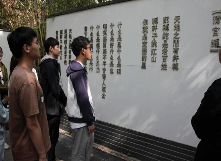同学们走进衡尺园,这里景观外形如尺 ,水体与景墙相互呼应,地面刻有抽象度量秤,景墙上镌刻着“清官谣”。其寓意深刻,时刻提醒着大家公道自在人心,做事要有规矩,无论是做人还是为官,都需把握好尺度,体现出为公为民的高尚情怀。