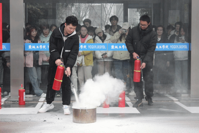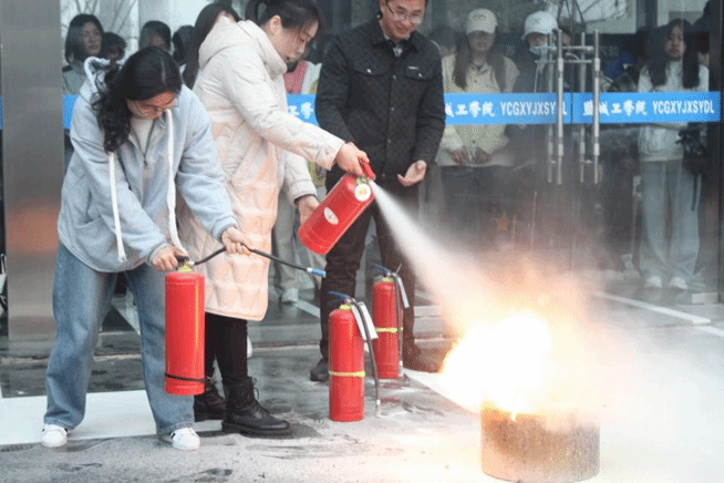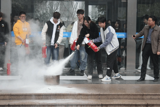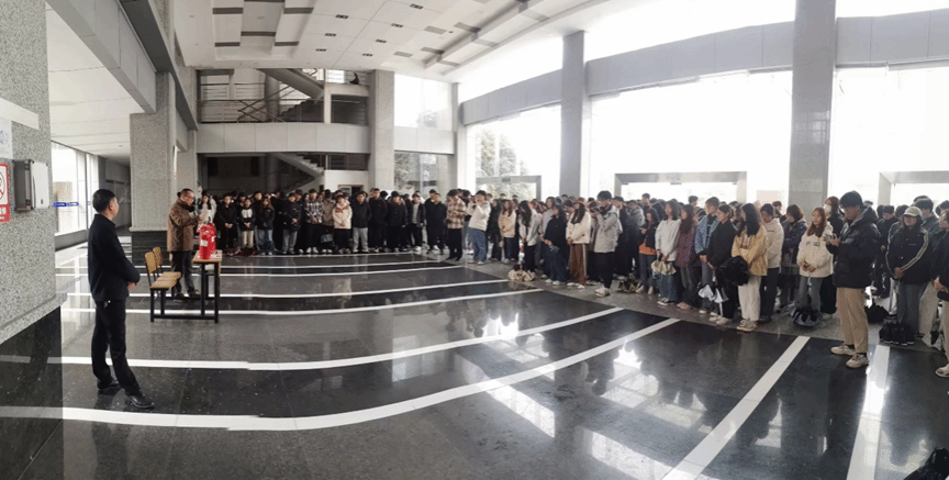 活动中,同学们在现场使用灭火器进行灭火操作。以班级为单位,从六楼模拟突发事件进行消防逃生演习。在老师带领下,大家迅速且有序地撤离到安全区域。王笃军带领员工到实验楼五楼学习如何使用喷淋装置,并且详细讲解了进入实验室的安全注意事项和实验楼的安全通道。