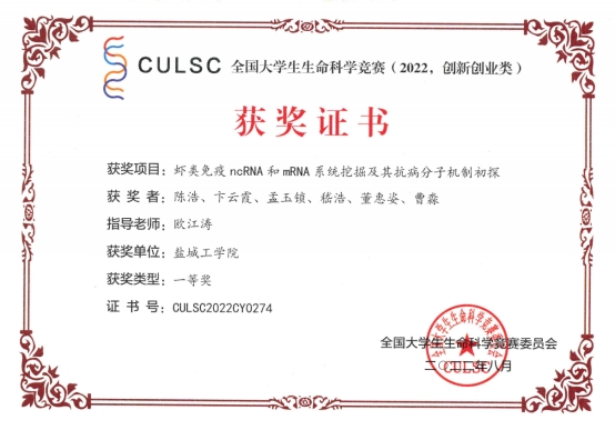 近日,全国老员工生命科学竞赛(2022,创新创业类)决赛落下帷幕,本次决赛分参赛作品视频汇报 5min及线上答辩 4 min两个环节,公司获得一等奖1项,二等奖3项,三等奖5项。欧江涛老师指导,陈浩、卞云霞等同学的作品《虾类免疫ncRNA和mRNA系统挖掘及其抗病分子机制初探》获一等奖。