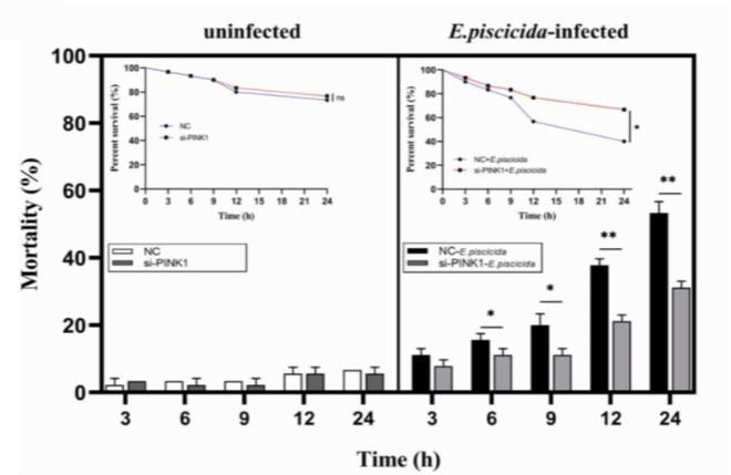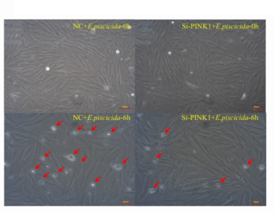 该研究在构建E. piscicida感染大口黑鲈个体模型和细胞模型的基础上,通过透射电镜、荧光染色、western blot等方法明确了E. piscicida感染能够导致大口黑鲈发生线粒体自噬。在此基础上,通过RNA干扰、透射电镜、western blot、荧光定量PCR等方法明确了E. piscicida诱导的线粒体自噬是由经典的线粒体自噬通路PINK1/Parkin所介导的。敲降PINK1基因能够显著降低E. piscicida的胞内增殖及感染E. piscicida后大口黑鲈死亡率,表明线粒体自噬的发生利于E. piscicida的胞内增殖及毒力的维持。之后,发现敲降PINK1能够抑制大口黑鲈piscidin-1、piscidin-3等抗菌肽基因及IL-10、TNF-α等炎性细胞因子基因的表达,提示PINK1途径通过抑制大口黑鲈的固有免疫及炎症反应而利于E. piscicida的胞内增殖。该研究首次揭示了大口黑鲈PINK1/Parkin介导的线粒体自噬在杀鱼爱德华菌感染中的作用机制,丰富了鱼类线粒体自噬与胞内致病菌感染关系的认识,也为开发新的抗胞内致病菌感染防治策略提供了科学依据。