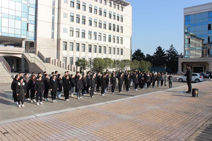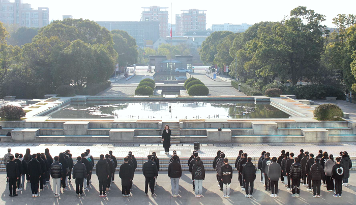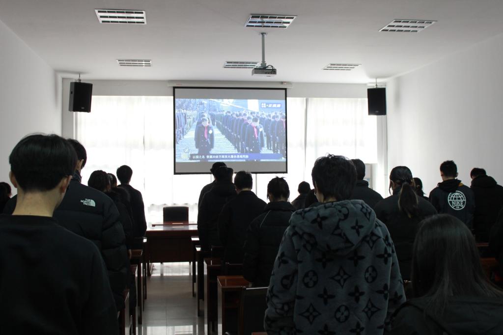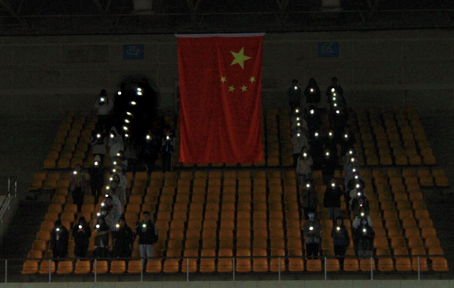 八点半,参加活动的60余名同学站成方阵,面向五星红旗齐声共唱国歌,喊出充满斗志的壮烈口号“以史为鉴,开创未来。铭记历史,强国有我。”海鲨特战旅退伍军人,B生物191班的张阔发言,她结合自己在部队的生活,回顾革命前辈们的艰苦奋斗,呼吁同学们要不怕困难,自信自强。2021级新生房冠辰同学代表发言,他表示真切地感受到历史的沉痛,但更为祖国今日的强大而自豪。作为大一新生,同学们应该努力学习,增强本领,创造未来。员工集中在体育馆,在黑暗中用手机闪光灯拼凑出12.13日期符号,祭奠遇难同胞,缅怀革命先烈。员工们还在学院会议室观看了国家公祭日的直播。直播结束后,员工们全体起立,向遇难同胞默哀。B海洋202的陈诗豪说道:“参与这次活动,我意识到国家公祭日绝不仅仅是为了发思古之幽情,我们更应该吸取历史教训,居安思危,痛定思痛,知耻后勇,刻苦学习。我作为员工干部,更要响应习近平总书记对中国青年“立大志、明大德、成大才、担大任”的号召。”