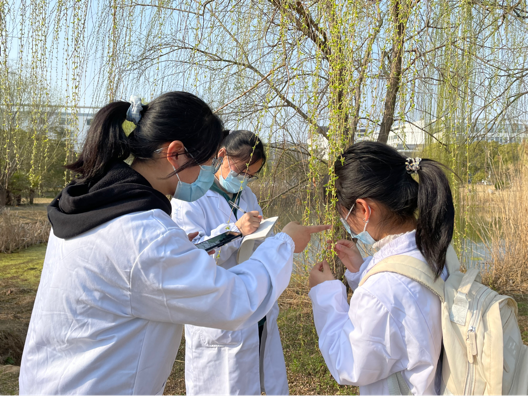 2022年3月12日上午9点,参加活动的同学迎着朝气蓬勃的日出,顺着幽静的小径来到了教室里。各团支书在教室里为同学们介绍植树节的由来,让同学们细致地了解植树节的意义,并且举行了植物有奖竞猜活动。有趣的竞猜活动之后同学们全体出动来到校园各地辨认学校里的植物。春天到来柳叶吐翠了,走在校园里的河边,大家看着“万条垂下绿丝绦”的景象,纷纷知道了这是柳树。微风轻抚,许许多多的纤细柳枝,几滴晶莹的水珠留在柳枝上,在阳光的照耀下闪着七彩的光芒。迎春花,不惧寒风吹霜雪打,率先把春天到来的消息报告给人们。刚刚发现她的时候,大家只觉得它全身金灿灿的,远远看去好像一片片小金叶,很多人都不认识。仅有的几个认识她的同学也只是能说出她的名字,对于她的典故却无从知晓,大家便拿出了手机进行百度,在网络的帮助之下同学们对她有了新的认识,获得新知的喜悦在他们的脸上漾起。