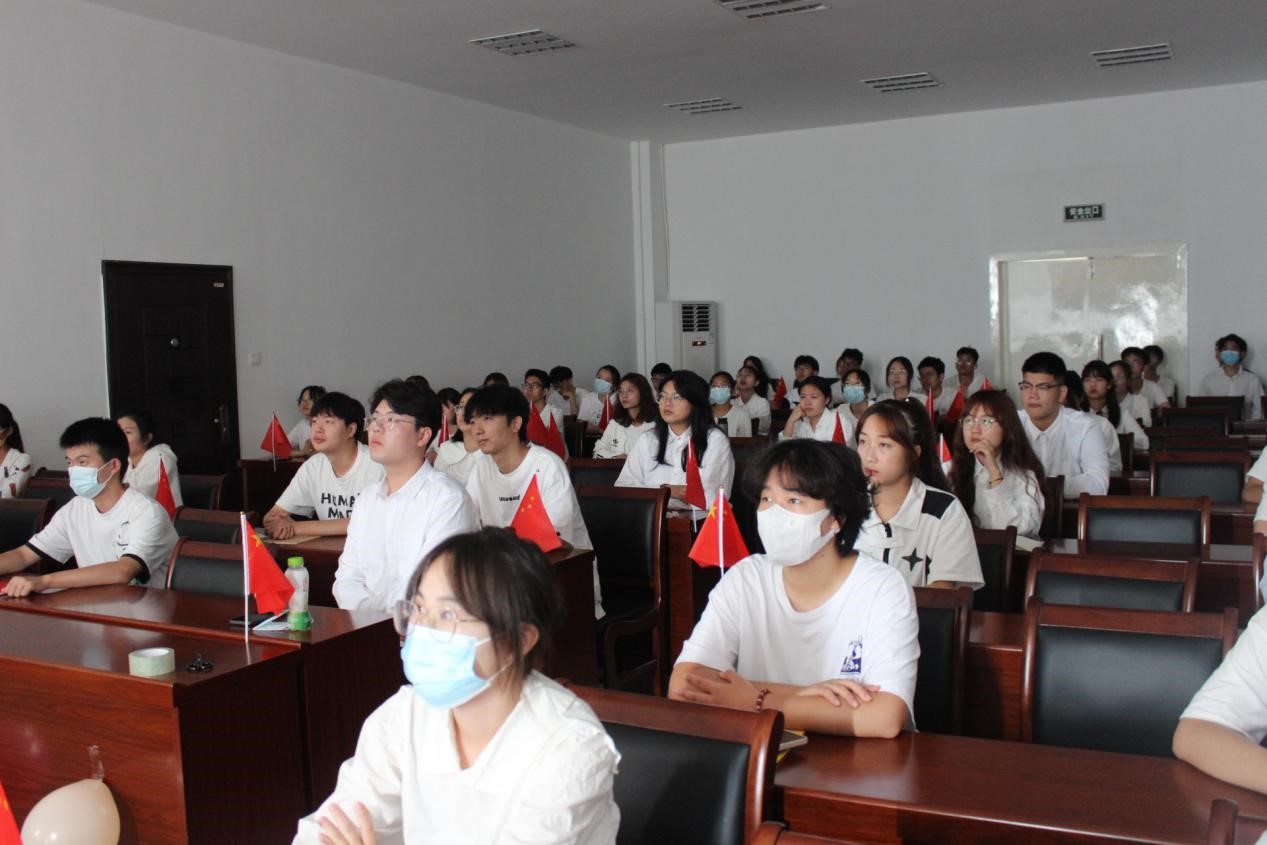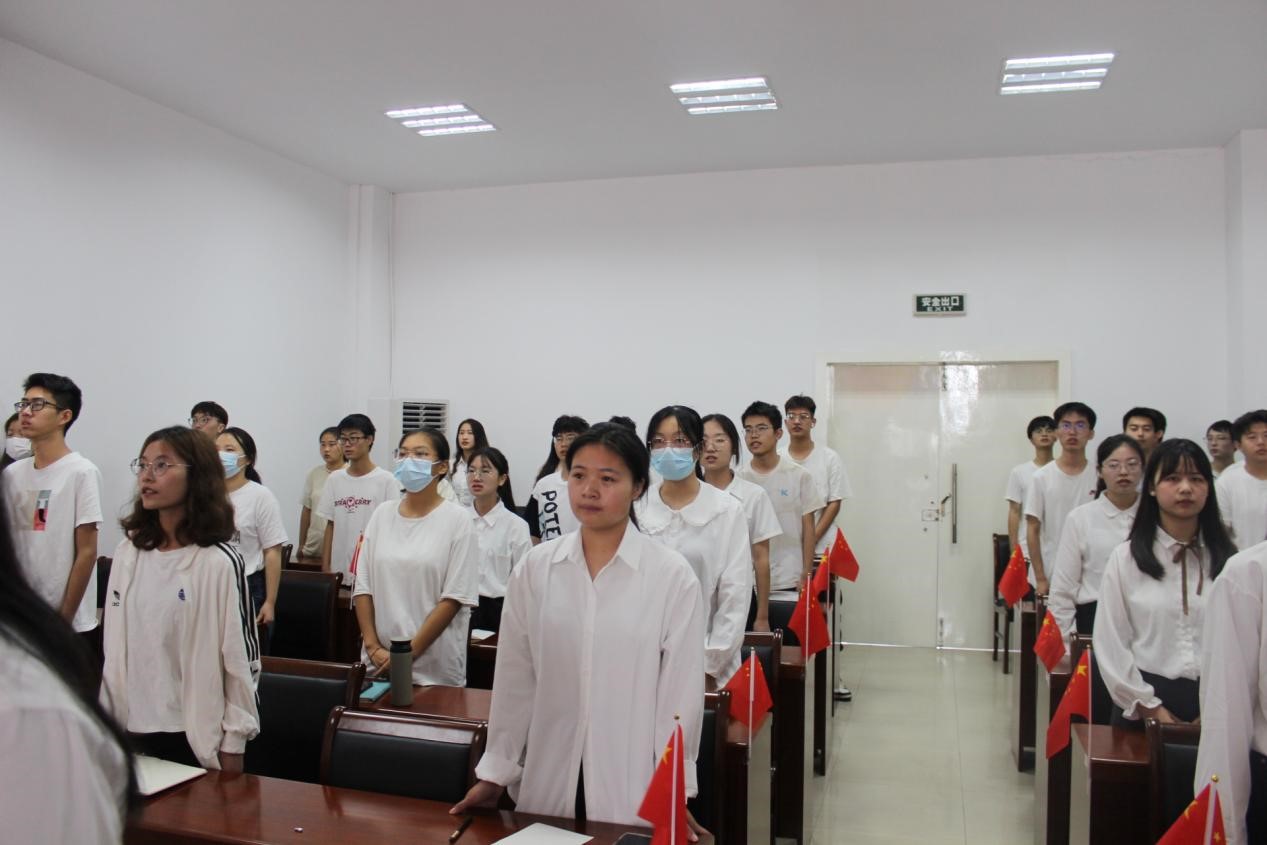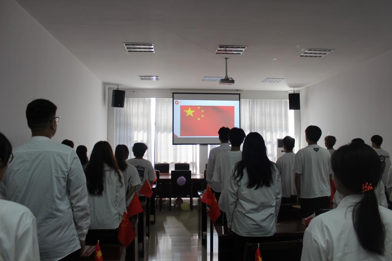 上午9点,新生辅导员霍福松,大一、大二各班班委共51人齐聚学院会议室。大家面对国旗,共唱国歌。国歌后,霍福松老师希望每一位同学树立高度的民族自尊心和自信心,立足当下,用实际行动践行爱国奋斗精神。本次活动由食品211岳婷同学主持。