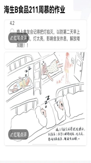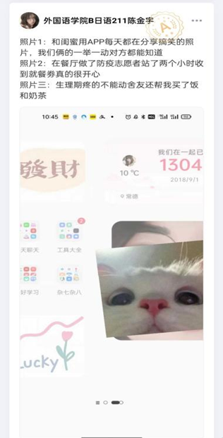 打卡活动中,有的同学用画笔描绘出自己一天中的“高光时刻”,“投喂了学校的小可爱”简单的校园生活,也多了很多乐趣;有的同学临睡前用手机拍下了宿舍窗外的月色,把月亮想象为“芭蕾舞女”,是一种别样的浪漫;还有的同学用诗句记录下春日的阳光,清晨的薄雾,漫步在校园中,体味诗意生活。