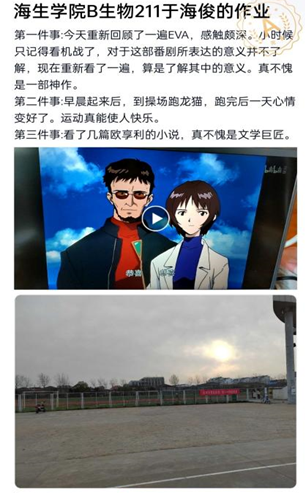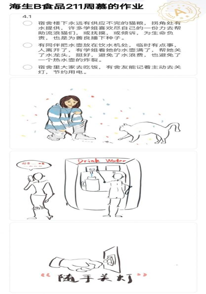 目前,打卡活动已进行一周。B食品191的冯婉君说:“刚开始几天,感觉有点困难,有点别扭,有时绞尽脑汁想啊想,搜啊搜,到底有什么好事发生?它又是为什么?太费脑筋了!后来练习的进行就越来越熟练了,被动完成也转变为主动完成。”