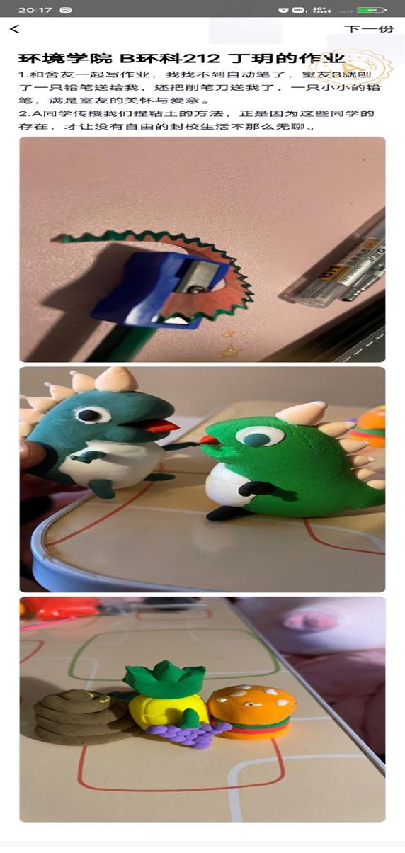 B环科212丁玥同学的室友可是个乐于助人的“雷锋”呢,不知道看到这个削笔刀的朋友们是不是想起了自己的小学时光。捏粘土让封校的生活有趣了许多。