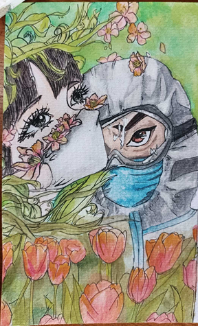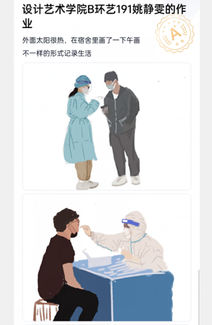 疫情期间其实陪伴我们同学最多的不就是为我们做核酸的工作人员们嘛?同学们用画笔来表达他们对这些大白的感激之情,坚定了在抗疫期间携手同心的信心,也分享了抗疫期间的温暖和真情。