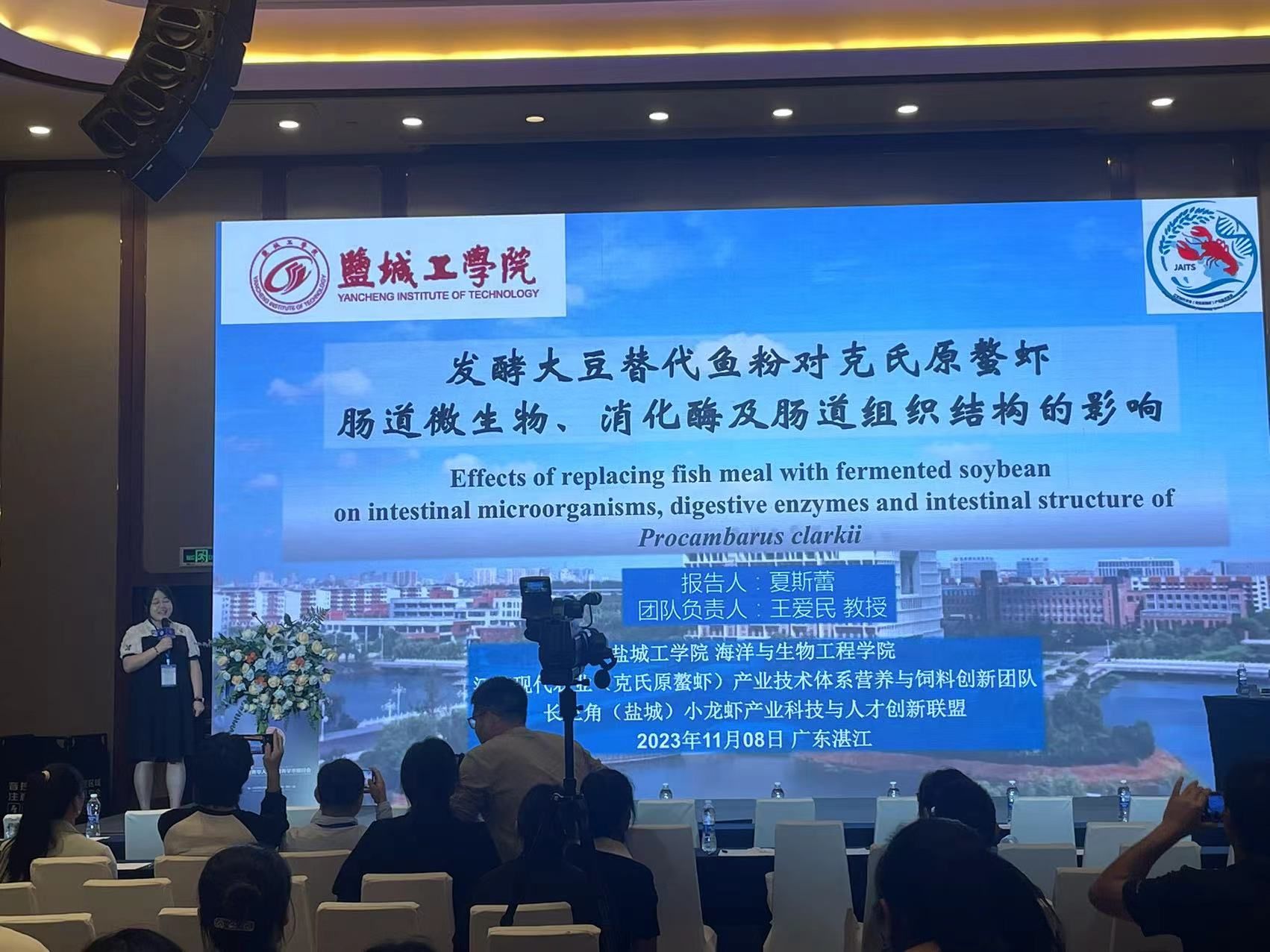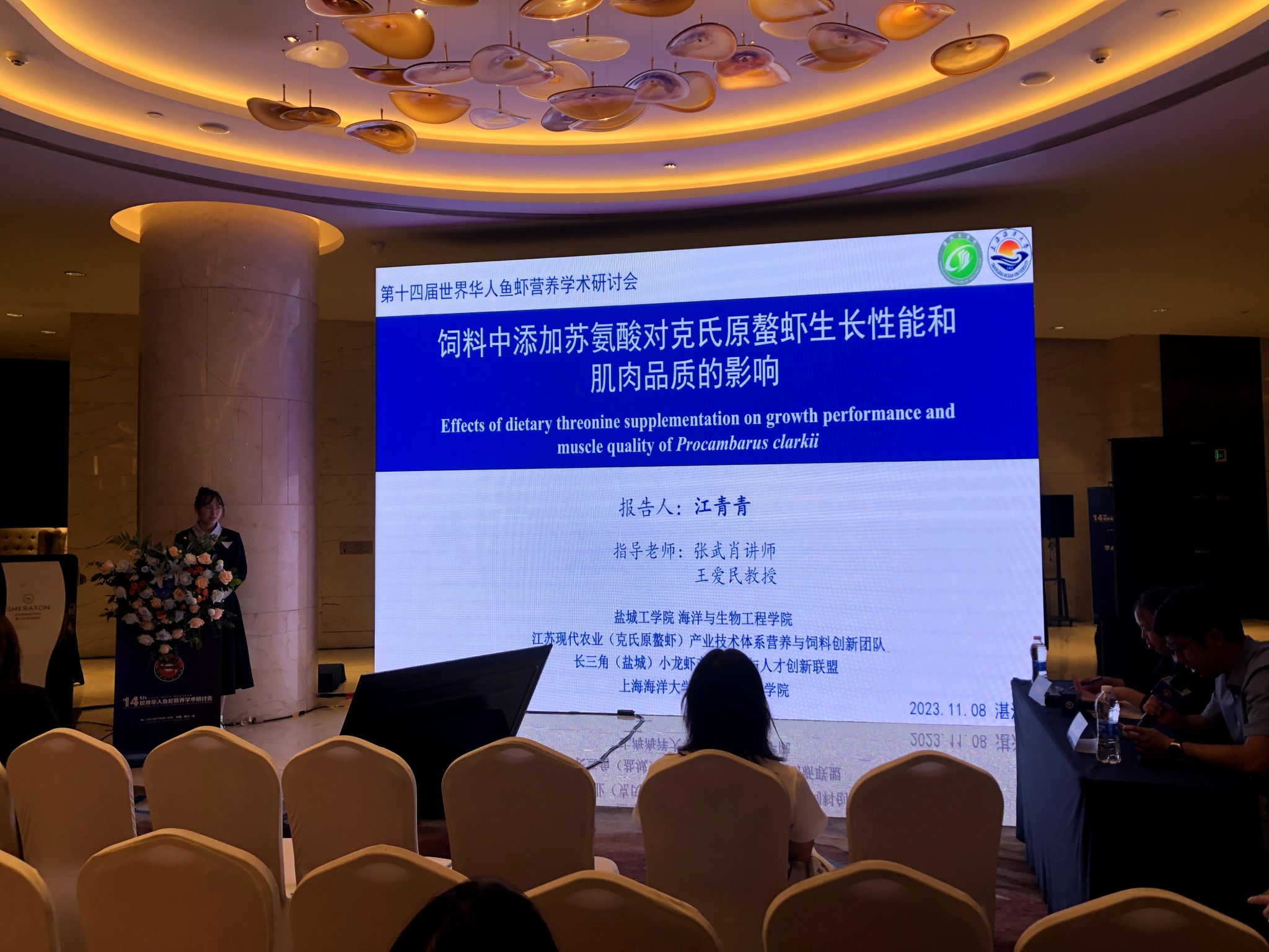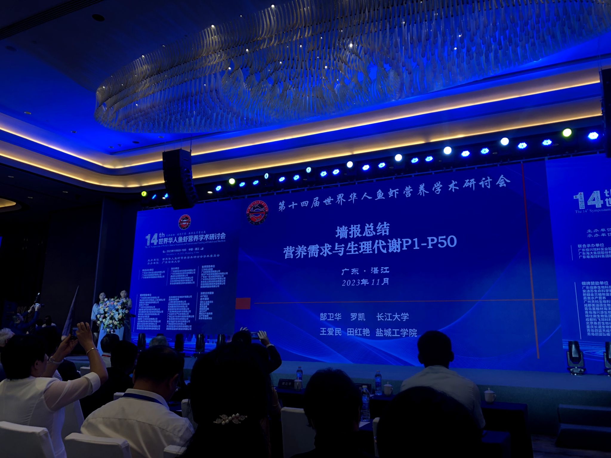 2023年11月6日至10日,第十四届世界华人鱼虾营养学术研讨会(简称“世华会”)在广东湛江召开,英国上市公司365水产动物营养与饲料研究所田红艳副教授,张武肖、夏斯蕾、潘明珠三位博士和团队研究生江青青、胡长东和李敖等参加交流研讨。夏斯蕾在大会上作学术报告。