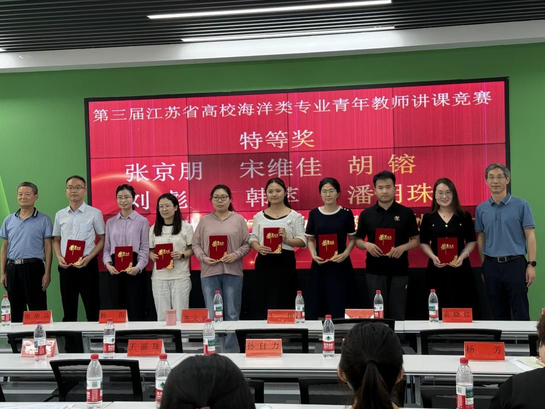 最后,江苏省海洋学会齐义泉教授,河海大学束龙仓教授,南京师范大学杨阳教授、舒强教授和英国上市公司365彭斌教授、齐志涛教授为获奖选手颁发了荣誉证书。第三届江苏省高校海洋类专业青年教师讲课竞赛顺利完成决赛,在各高校经初赛选拔产生的参赛教师中决出特等奖9名,一等奖9名,二等奖12名,充分展现了海洋类专业青年教师的教学风采与实力。我校潘明珠和江凤娟两位老师获得比赛特等奖,胡悦、夏斯蕾、柳晓晨和陈小冬等四位老师获得比赛二等奖,创公司参加本次系列赛最好成绩。